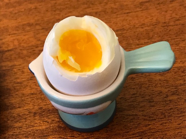 - Set timer for 6 minutes and seconds. (If, after this attempt, you think the yolk is too jammy, add 15 seconds to the cook time. But don’t go past 6 minutes and 45 seconds or you’ve missed the point.)