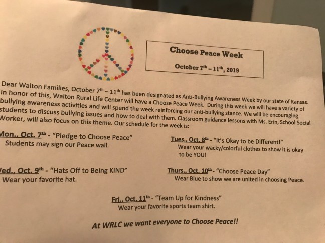 So I was really delighted by a recent activity at my younger son’s elementary school. For Choose Peace week, students were encouraged to wear clothes that expressed a key school value–like kindness, peace, unity, and appreciation of differences. AND they did it by wearing things they probably already own and are likely to be clean (though we own no sports teams gear).