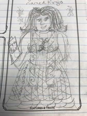 We began our first game, led by my older son, who has an amazing talent for story-telling that I probably wouldn’t have noticed if it weren’t for this game. We spent hours developing our characters. Here’s a sketch of mine: